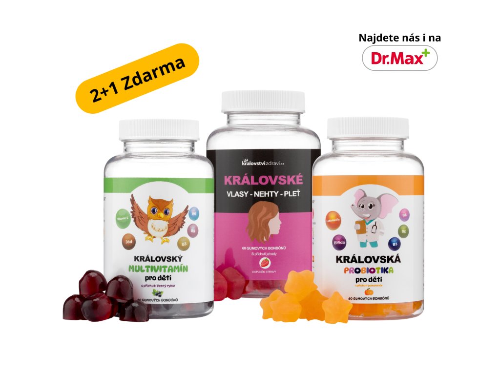 Při koupi Královských vlasů, nehtů, pleti a Královského multivitamínu pro děti získáte Královská probiotika pro děti jako dárek zdarma.