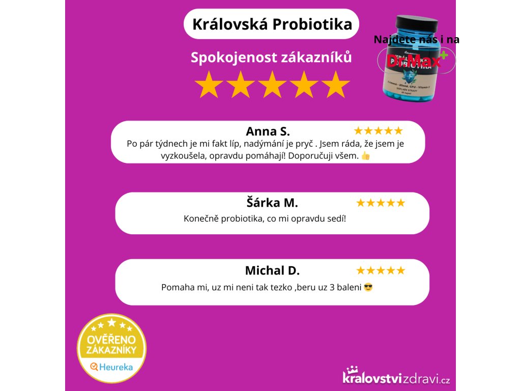 Královská Probiotika obsahuje vyvážený komplex laktobacilů a bifidobakterií, které podporují zdraví trávicího systému a celkovou pohodu organizmu.